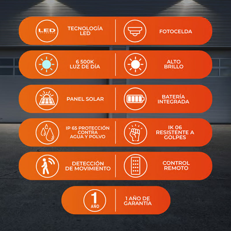 Luz de Día, Sensor de Movimiento, Control remoto incluido, Batería Integrada, IP65, IK06, LED integrado
