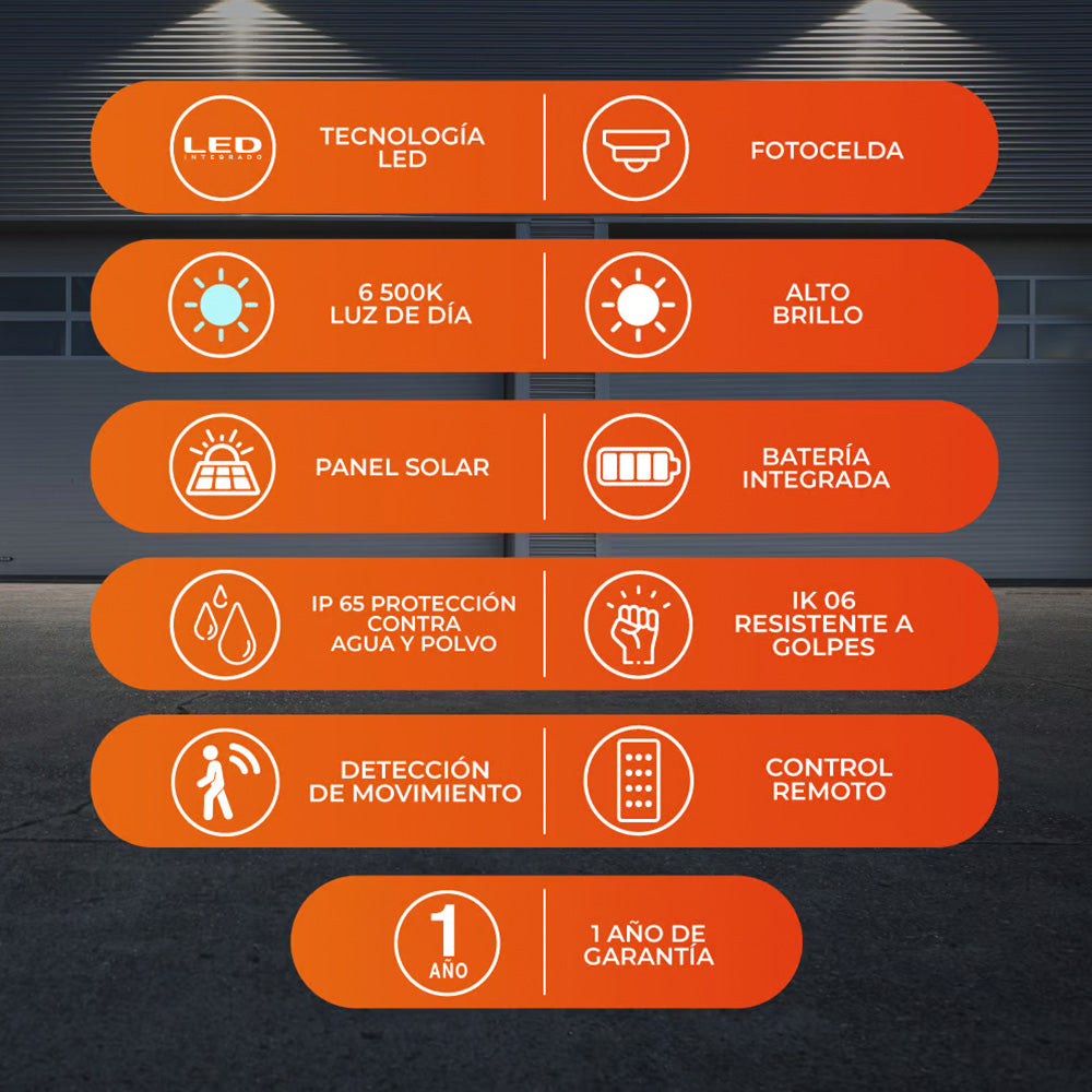 Luz de Día, Sensor de Movimiento, Control remoto incluido, Batería Integrada, IP65, IK06, LED integrado